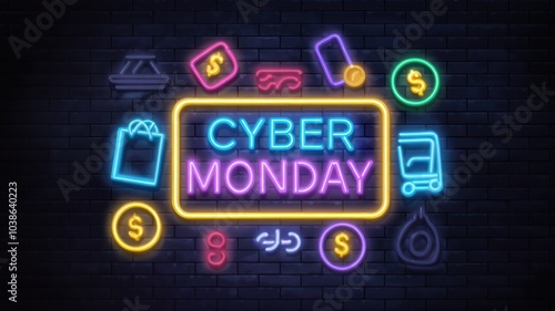 Cyber Monday neon sign surrounded by shopping symbols on a dark background.