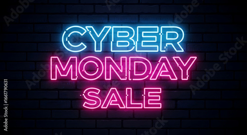 Cyber Monday Sale Neon Sign on Brick Wall for Online Shopping Promotion and Holiday Season Marketing and Advertising