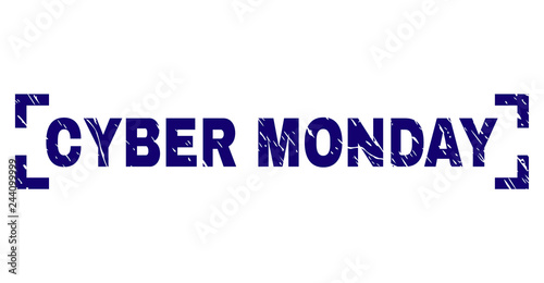 CYBER MONDAY title seal print with distress texture. Text label is placed between corners. Blue vector rubber print of CYBER MONDAY with dirty texture.