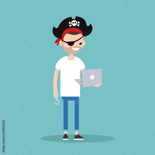 Cyber piracy. Conceptual illustration. Young bearded man wearing pirate outfit and holding a laptop / editable flat vector illustration, clip art
