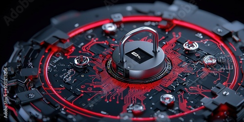 Cyber Security Concept Padlock on Circuit Board with Red Glowing Light