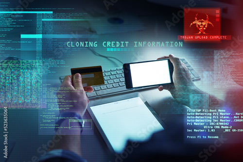 Cyber security, hacking and fraud with a computer hacker holding a credit card and phone while cloning a bank account. Theft, crime and data protection with CGI, special effects or overlay background
