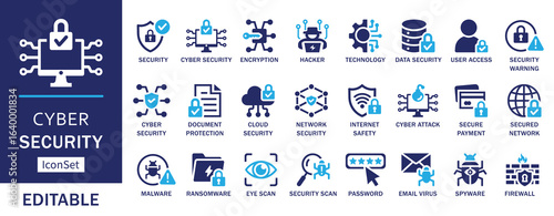 Cyber security icon set showing encryption, hacker, firewall, and data protection symbols.