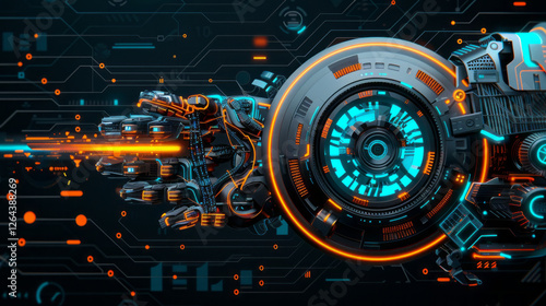 Cybernetic Arm Reaching: A powerful, futuristic cybernetic arm with glowing neon lights extends its reach across a dynamic circuit board backdrop, capturing the essence of cutting-edge technology.