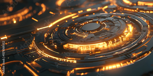 Cybernetic Core: Glowing orange circuits and metallic textures converge in a mesmerizing, futuristic close-up. Intricate details and a high-tech aesthetic create a captivating image perfect for tech.