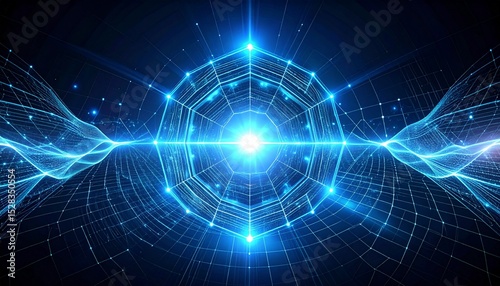 Cybernetic core radiating energy waves, hexagonal patterns expanding outward, blending seamlessly into a virtual reality environment
