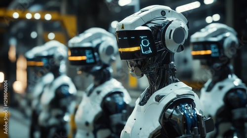 Cybernetic factory workers wearing neural interface headsets, merging human intelligence with AI-assisted production