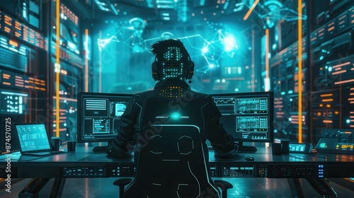 Cybernetic hacker character with neon implants working at a computer in a dark futuristic room