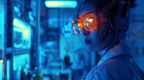 Cybernetic human with glowing eyes in lab, over-the-shoulder view, dimly lit, cold blue hues.