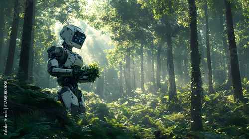 Cybernetic park ranger robot, ai interfacing, tending to digital flora and fauna in the virtual wooded landscapes 3d render, spotlight, hdr. Cybernetic Forest Guardians. Illustration