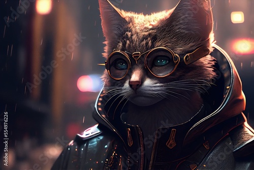 cyberpunk cat at night time in city