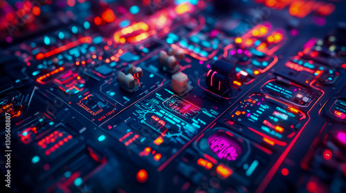 Cyberpunk Circuit Board: Futuristic Tech Interface with Neon Glows and Complex Data Visualization for High-Tech Illustration