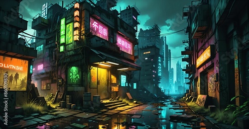 cyberpunk city buildings sci fi futuristic wasteland cyber slums at night. neon signs dystopian town ghetto urban downtown business and houses night life.