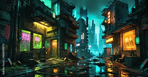 cyberpunk city buildings sci fi futuristic wasteland cyber slums at night. neon signs dystopian town ghetto urban downtown business and houses night life.