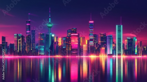 Cyberpunk city skyline at night with vibrant neon lights and a colorful background. Wide city front view with a retro wave feel.