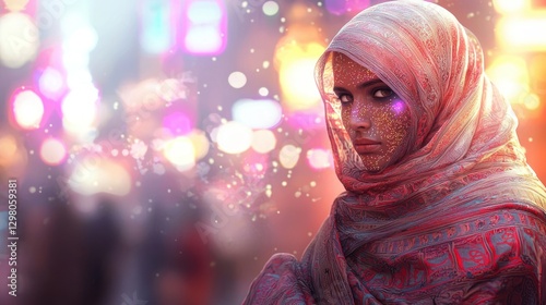Cyberpunk Cityscape: Enigmatic Woman in Red Veil