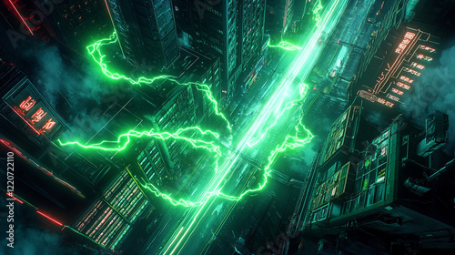 Cyberpunk Cityscape Green Lightning Neon Night Electric Energy Futuristic Art Glow Dark Style Power