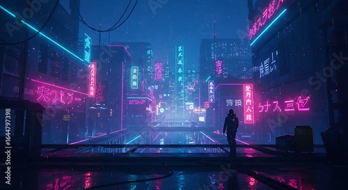 Cyberpunk Cityscape: Neon Lights Rain and Solitary Figure in Futuristic Urban Setting.