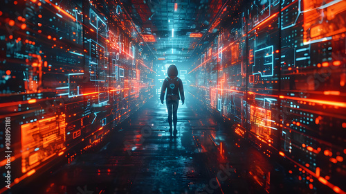 Cyberpunk Digital Corridor: A hooded figure walks through a futuristic tunnel of vibrant red and blue digital data streams, showcasing intricate code and network patterns.