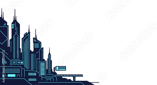 Cyberpunk metropolis vector frame, flat design, clean lines, white background, editable.