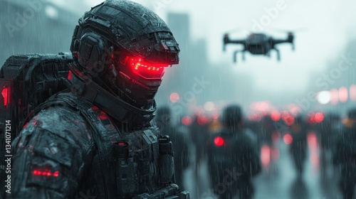 Cyberpunk Soldier Commanding Drone Squadron in Corporate Warfare with Cybernetic Enhancements and Tactical Strategy