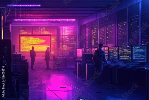 Cyberpunk-style server room; programmers work late. Illustrates tech, coding, and late-night work culture.