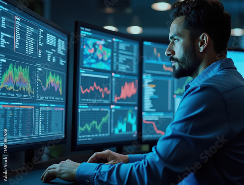 Cybersecurity analyst monitoring a digital dashboard in a high-tech control room