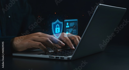 Cybersecurity and Data Protection Concept: Person Working on Laptop with Digital Shield and Lock Icon