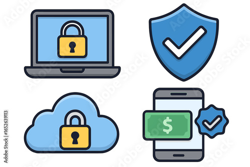 Cybersecurity and data protection icon set. Secure online payment, cloud computing and mobile banking symbols. Vector illustration of digital transaction trust and privacy.