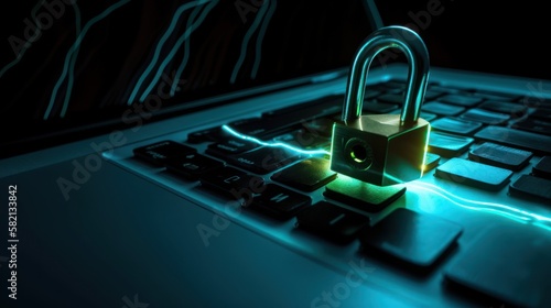Cybersecurity concept. Door lock on laptop and microchips. Symbol of cyber security, antivirus, firewall, data privacy and safe internet.