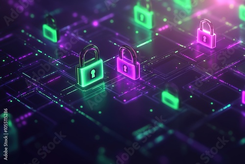 Cybersecurity concept with glowing padlocks on a digital circuit board.