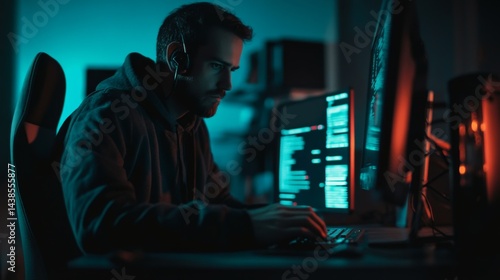 Cybersecurity expert analyzing data breach tech lab image dim lighting side view threat prevention