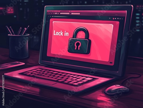 Cybersecurity Lock on Laptop Screen: Digital Protection and Security Illustration for Secure Online Activity and Data Privacy in a Modern Workspace.