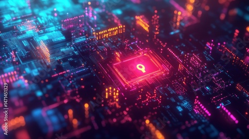 Cybersecurity Network: Digital Key in a Glowing Circuit Board