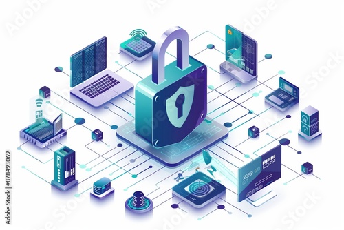 Cybersecurity Network Protection Illustration, featuring a shield with a lock surrounded by network nodes, symbolizing data security, online protection, and digital safety.