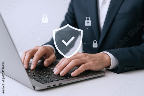 Cybersecurity Professional Protecting Data with Laptop: Security Shield Icon Overlay for Secure Online Business