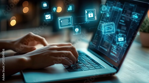 Cybersecurity Professional Working on Laptop with Data Encryption and Protection Icons