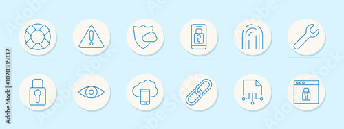 Cybersecurity set icon. Lifesaver, alert, cloud shield, fingerprint, wrench, padlock, eye, phone cloud, chain, document, browser with lock.
