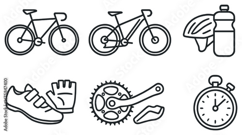 Cycling linear icon set. featuring road bike, mountain bike, helmet, water bottle, shoes, gloves, stopwatch
