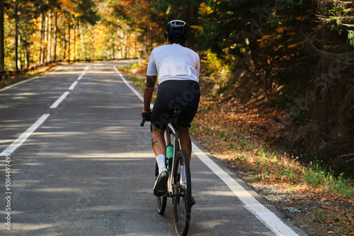 Cyclist rides a road bike on a scenic autumnal road. Enjoy the vibrant colors and peaceful atmosphere of this breathtaking outdoor scene. Transfăgărășan. Romania