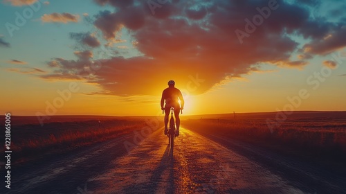 Cyclist silhouetted against a vibrant sunset on a country road.