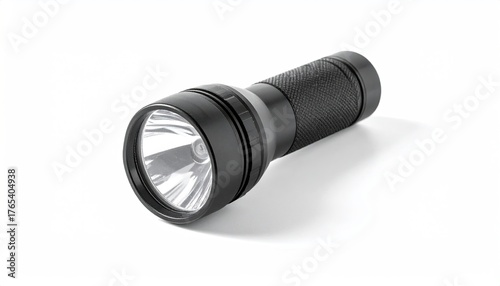 Cylindrical black flashlight, textured handle, angled reflector