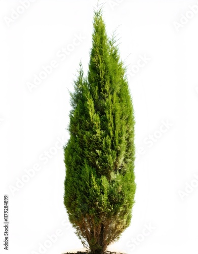Cypress tree standing tall, verdant green branches spreading, white background highlighting natural elegance of botanical specimen