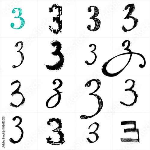 Cyrillic and Latin alphabet. Number 3. Uppercase Russian and Ukrainian handwritten fonts. Drawn with paint and chalk vector fonts. Handwritten letters. Can be used as logo, posters fonts.