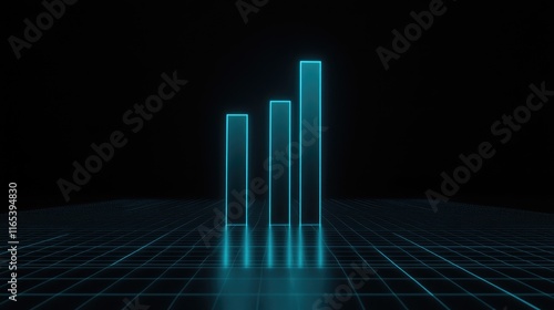 D bar graph with matte bars in shades of blue and gray, placed on a glossy grid floor with ambient lighting, conveying data visualization