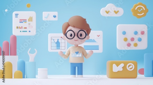 D Cartoon Character with Chart Data Analysis and Success Icons