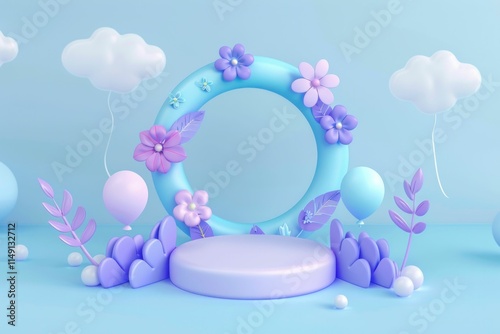 D pastel decoration, flowers, balloons, playful scene, colorful backdrop, soft shapes, whimsical atmosphere, perfect for celebrations, birthdays, or events, charming design