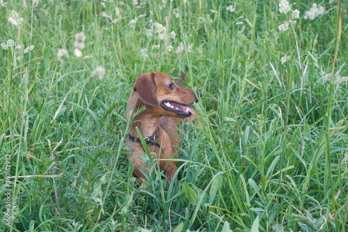 Dachshund puppy walking in the park, summer day, selective focus