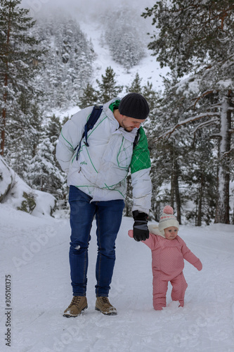 Dad and daughter Winter in mountains