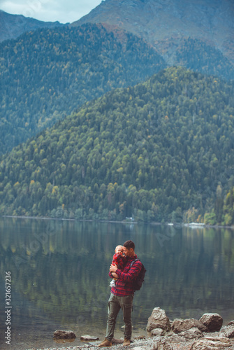 Dad and son walk by the lake